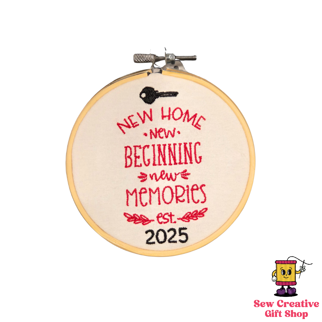 This "New Home, New Beginning, New Memories" Embroidered Round Ornament, a heartwarming and personalized addition to commemorate your journey into your new abode. Measuring 4 inches in diameter, this ornament is green framed in a wooden hoop and is a timeless keepsake to mark the establishment of your home in 2025.
