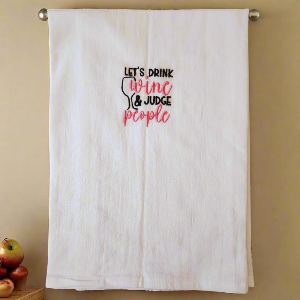 Indulge in vino and criticism with this embroidered towel. Perfect for parties, the phrase "Let's drink wine and judge people" adds a playful spin to any gathering. So grab a glass and let the fun (and judging) begin!